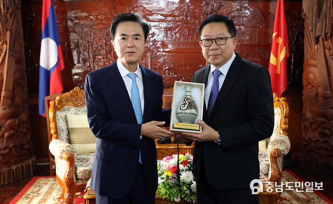 김태흠 지사는 지난 18일 라오스 비엔티안에 위치한 농업환경부 접견실에서 린캄 두앙사완 장관을 만났다.