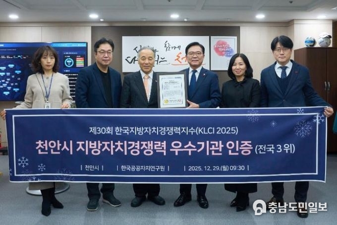 (충남도민일보 =천안) 정연호기자/ 천안시는 올해 한국지방자치경쟁력지수(KLCI) 조사에서 2년 연속 3위를 차지하며 (사)한국공공자치연구원으로부터 인증서를 받았다고 29일 밝혔다.