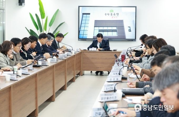 (충남도민일보 =금산) 김천호기자/ 박범인 금산군수는 지난 5일 금산농유원에서 간부회의를 열고 금산농유원에 담긴 의미를 설명하며 이곳에서 열리는 농업인 실용교육 등을 추진하는 데 농업인에게 실질적인 도움이 되도록 신경 쓸 것을 당부했다.