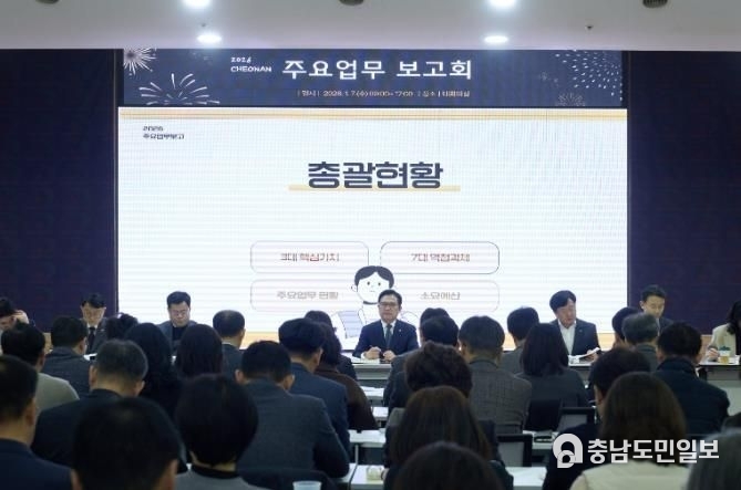 (충남도민일보 =천안) 정연호기자/ 천안시는 7일 시청 대회의실에서 ‘2026 주요업무 보고회’를 열고 도시 경쟁력 강화를 위한 주요 정책 방향을 논의했다.
