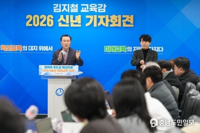 (충남도민일보 =충남) 정연호기자/ 김지철 충남교육감은 8일, 도교육청 회의실에서 ‘2026 신년 기자회견’을 열고, ‘2025년 주요 성과와 2026년 12대 중점 추진 과제’를 발표했다.