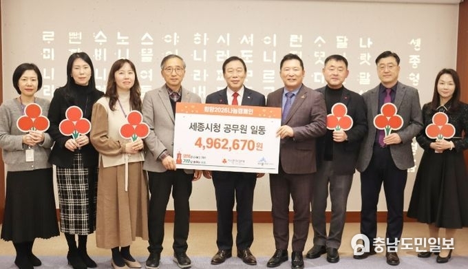 (충남도민일보 =세종) 정연호기자/세종사회복지공동모금회에 따르면 14일 14시30분 세종시청 5층 세종실에서 최민호 세종시장, 박상혁 세종모금회장, 김윤회 세종모금회 부회장 등이 참석한 가운데 ‘희망2026나눔캠페인 희망성금 전달식’을 가졌다.