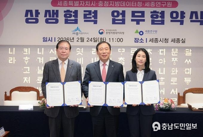 (충남도민일보 =세종) 정연호기자/ 세종특별자치시와 충청지방데이터청, 세종연구원이 24일 시청 세종실에서 데이터 기반 정책 수립 지원 등을 위한 상생협력 업무협약을 체결했다.