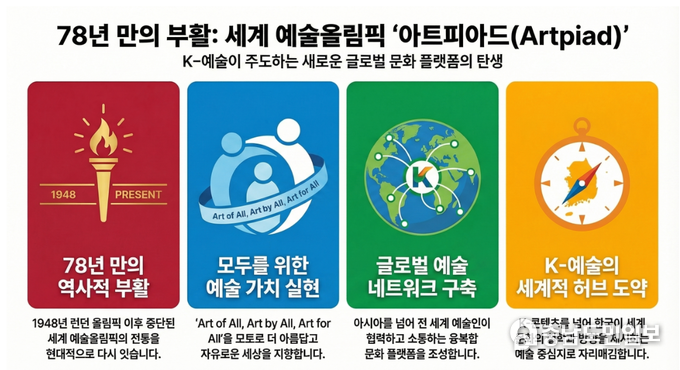 김종욱 IAA 세계전략기획위원장은 이날 발표에서 “예술올림픽은 한때 올림픽과 함께 인류 문화의 이상을 상징했던 제도였으나 1948년 런던올림픽 이후 역사 속에서 사라졌다”며 “이번 아트피아드는 78년 동안 단절되었던 세계 예술올림픽의 전통을 다시 잇는 역사적 출발점”이라고 강조했다.