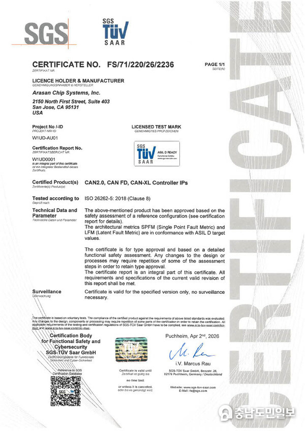새너제이, 캘리포니아, 2026년 4월 22일 /PRNewswire/ -- 모바일 및 자동차용 SoC를 위한 IP 분야의 선도적 공급업체인 아라산 칩 시스템즈(Arasan Chip Systems)가 CAN XL IP의 ASIL-D 인증 획득을 발표했다. CAN XL IP는 도로 주행 차량 기능 안전에 대한 국제 표준인 ISO 26262에서 정의한 기능 안전 최고 등급인 ASIL-D로 SGS-TÜV 자르(SGS-TÜV Saar)의 독립 인증을 받았다.