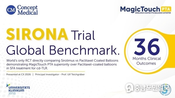 런던, 2026년 4월 28일 /PRNewswire/ -- 콘셉트 메디컬(Concept Medical Inc.)이 4월 27일, 채링 크로스(Charing Cross, CX) 심포지엄 2026에서 시로나(SIRONA) 무작위배정 임상시험의 예비 3년 추적 관찰 데이터 발표를 통해 말초 중재술을 위한 약물 전달 기술 분야에서의 리더십을 강화했다고 발표했다.