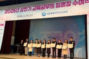 (충남도민일보 =세종) 정연호기자/ 세종특별자치시교육청은 3월 1일 자 인사발령에 따른 교육공무원 109명에 대한 임명장 수여식을 2월 25일에 본청 2층 대강당에서 개최했다. 이번 임명장 수여식은 승진·전직자 49명과 신규교사 60명을 대상으로 진행됐으며, 교육전문직원, 교장·원장, 교감·원감, 신규교사가 참석한 가운데 새로운 출발을 축하하고 각오를 다지는 자리로 마련됐다. 임명장을 받은 인원은 ▲교육전문직원 18명 ▲교장·원장 13명 ▲교감·원감 18명 ▲신규 교사 60명으로 총 109명이다. 구연희 교육감 권한대행은 축사를 통해 “교직에 첫발을 내딛던 날의 두근거림과 새로운 임지로 향하는 오늘의 설렘을 잊지 말아달라.”라고 당부하했다. 특히 “인공지능(AI) 디지털 교과서 도입 등 급변하는 교육 환경 속에서도 기술이 대체할 수 없는 선생님의 따뜻한 연결이 무엇보다 중요하다.”라고 강조하며, ”학생 개개인의 특성을 살리는 인공지능(AI) 기반 맞춤형 교육을 통해 ‘모두가 특별해지는 세종교육’의 비전을 실현하는 주역이 되어달라.”라고 말했다. 구연희 교육감 권한대행은 109명의 대상자 전원에게 직접 임명장을 수여하며 새로운 시작을 축하했다. 이어 신규교사