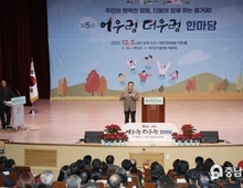 (충남도민일보 =태안) 문성호기자/ ‘주민이 행복한 마을’ 조성을 위한 주민들의 소통 한마당 행사가 충남 태안군에서 개최됐다. 군은 지난 5일 태안문화원에서 가세로 군수 등 군 관계자와 마을만들기협의회 관계자, 마을 주민 등 200여 명이 참여한 가운데 ‘제5회 어우렁더우렁 한마당’ 행사가 개최됐다고 밝혔다. 태안군이 주최하고 태안군마을만들기협의회(회장 조대현)가 주관한 이번 행사는 ‘마을만들기’ 단계별 사업에 참여한 마을들이 모여 서로의 성과를 공유하고 상호 협력을 도모하는 자리로 관내 31개 마을 주민들이 참여해 성황을 이뤘다 이날 행사에서는 소원면 시목초 2학년 학생들의 부채춤 공연과 시목1리 동아리의 난타공연을 시작으로 우수마을 및 마을활동가 표창과 개회사 및 축사, 올 한해 진행된 마을만들기 활동을 담은 영상 시청 등이 진행됐다. 이후 충남형 마을만들기 사업(태안읍 인평2리) 및 소원면 마을관리소 활동 관련 사례발표가 이어졌으며, 김춘애 한국서비스교육원장이 강사로 나서 ‘행복한 마을을 위한 주민·리더 공감소통’을 주제로 강의를 실시해 좋은 반응을 얻었다. 이날 현장에서는 단계별 마을사업 활동과 2025년 마을교육 현황, 마을관리소 활동 등을 살펴볼