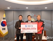 (충남도민일보 =충남) 정연호기자/ 충남도는 계룡건설로부터 이웃돕기 성금 1억원을 기탁받았다고 밝혔다. 12일 도청 접견실에서 열린 전달식에는 김태흠 지사와 이승찬 계룡건설 회장, 성우종 충남사회복지공동모금회장 등이 참석해 지역 나눔 실천의 뜻을 함께 나눴다. 성금은 충남사회복지공동모금회를 통해 도내 취약계층과 도움이 필요한 이웃을 지원하는데 사용될 예정이다. 김 지사는 “지역사회에 대한 깊은 관심과 책임감을 바탕으로 따뜻한 나눔을 실천해 주신 계룡건설에 감사드린다”며 “앞으로도 민관이 함께하는 나눔 문화 확산을 통해 촘촘한 복지 안전망을 구축해 나가겠다”고 말했다. 이 회장은 “작은 정성이지만 힘든 시간을 보내고 있는 이웃들에게 위로와 희망이 되기를 바란다”며 “앞으로도 지역사회와 함께하는 나눔 활동을 지속해 나가겠다”고 답했다. 한편, 계룡건설은 매년 나눔캠페인을 통해 충남‧대전‧세종에 이웃돕기 성금을 기탁하고 있으며, 산불 및 수해 피해 지원, 장학금 지원, 예비역 주거환경 개선, 범죄 피해자 지원 등 다양한 분야에서 사회공헌 활동을 꾸준히 전개하며 사회 곳곳에 온기를 전하고 있다.