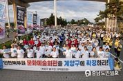 (충남도민일보 / TV / 정호영기자) 인천 북부권 문화예술회관 계양구 유치를 위한 범구민 대책협의회는 지역 주민 등 1,000여 명이 참여한 가운데 지난 31일 계양아라온 빛의 거리 일원에서 북부권 문화예술회관 계양아라온 유치를 위한 결의대회를 추진했다. 이번 결의대회는 현재 인천시가 광역 문화시설이 없는 북부권역에 1천석 이상 규모의 문화예술회관을 건립하고자 사업 타당성 용역을 진행하고 있는 가운데, 북부권 문화예술회관이 반드시 계양구에 유치되어야 한다는 주민들의 염원을 인천시에 전달하고자 추진됐다. 주민들은 이날 범구민 대책협의회의 주도하에 ‘인천시는 북부권 문화예술회관을 계양구에 확정하라’는 구호를 외치며 현수막과 홍보물을 펼치며 결의를 다졌다. 이날 결의대회에 참여한 주민들은 “계양구는 분구 이래 지난 30년 동안 아무런 기반시설 없이 각종 규제로 개발이 제한돼 왔고, 인구 10만 명당 등록 공연장 수가 인천 최하위 수준으로 그동안 문화예술의 소외지역으로 지내왔다.”라며 “인천 균형 발전의 차원에서도 북부권 문화예술회관을 반드시 계양구에 건립하여 주기를 간절히 바란다.”라고 말했다.