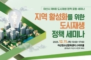 (충남도민일보=아산) 정연호기자/ 아산시는 한국도시재생학회(회장 이재우)와 공동 주관으로 오는 12월 11일 오후 1시부터 5시까지 아산시 청소년문화센터 스마트홀에서 ‘지역 활성화를 위한 도시재생 정책 세미나’를 개최한다고 밝혔다. 이번 세미나는 침체된 원도심을 활성화하기 위해 마련됐으며, 국토교통부 정우진 도시정책관의 ‘도시재생정책과 향후 과제’ 강연과 △재정 자율성 강화와 지속가능한 도시재생 △거점시설 활용한 주거지 정비와 원도심 활성화 전략을 주제로 한 기획세미나가 진행된다. ‘재정 자율성 강화와 지속가능한 도시재생’에서는 △사람공간E&C 최형선 대표의 ‘도시재생 지속 가능한 조직관리 및 지원센터의 역할’ △충북대 안상욱 교수의 ‘포괄보조 확대에 따른 지자체 재원확충과 활용’이 발표된다. 이어 ‘거점시설 활용한 주거지 정비와 원도심 활성화 전략’에서는 △LH토지주택연구원 김옥연 박사의 ‘저층주거지 활용과 원도심 성장거점화 전략’ △건축공간연구원 김영하 박사의 ‘도시재생으로 조성된 거점시설과 활성화 전략 및 청년 유입’ 등이 발표된다. 기획세미나 맞춤형 토론은 김호철 단국대 교수와 이재우 목원대 교수가 좌장을 맡고, 이경환 공주대 교수, 이상준 L
